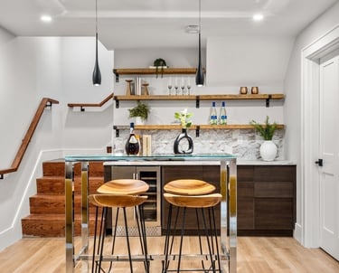 This basement was used to storage boxes and old furniture, our team transformed a unfinished basement into a elegant and super cozy place with a full bathroom, a bedroom and a full kitchenette bar with wine cabinet.